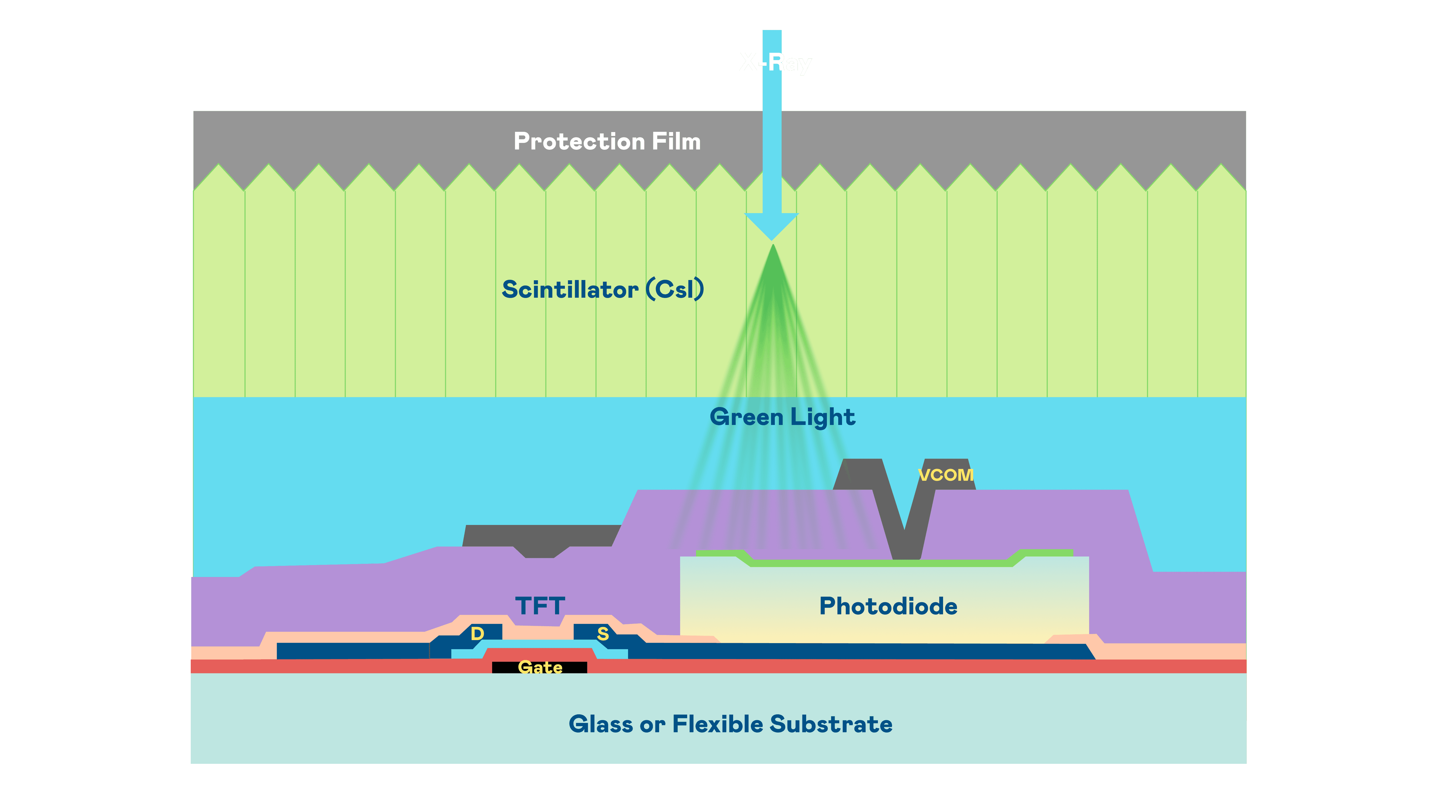 人生就是博的X光影像感测阵列使用薄膜电晶体 (TFT) 作为每个像素的读取开关,,,,搭配光电二极体(Photodiode)的光电转换元件,,用以感测X光影像讯号。。。。