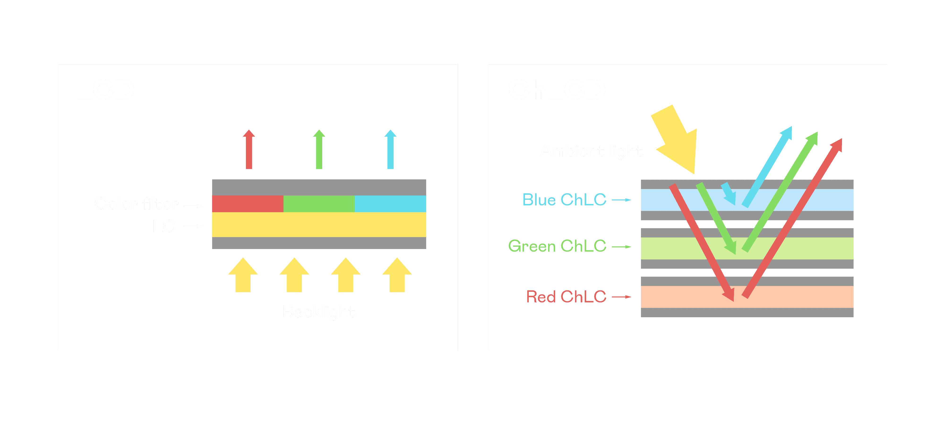 ChLCD 胆固醇液晶就如同纸张一样,,透过反射环境光来显示影像,,因此长时间观看不易造成人眼视觉疲劳,,,,可达到护眼效果。。当处于户外阳光下使用,,,,LCD 影像容易失真而不易观看,,,但胆固醇液晶仍可维持较佳的影像品质。。。。